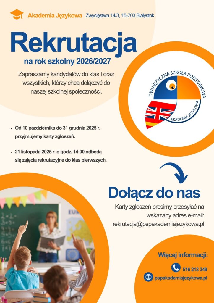 - zajęcia rekrutacyjne dla kandydatów na uczniów do klas pierwszych: 21 listopada 2025 r. godz. 14:00 (warunkiem jest przesłanie poprawnie wypełnionej karty zgłoszenia na adres mailowy ds. rekrutacji: rekrutacja@pspakademiajezykowa.pl)